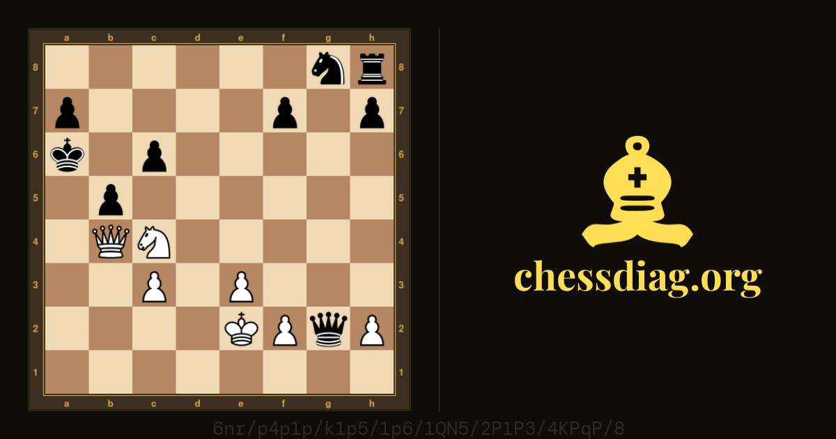 J’avoue personnellement avoir été rapide, imprécis et bête en regardant cette étude de Vojtěch Košek : Je me suis dit « Les noirs vont jouer Fc8, donc Cg5 gagne de suite, je continuerai par Ce7+, échangerai fou contre cavalier et pousserai…
