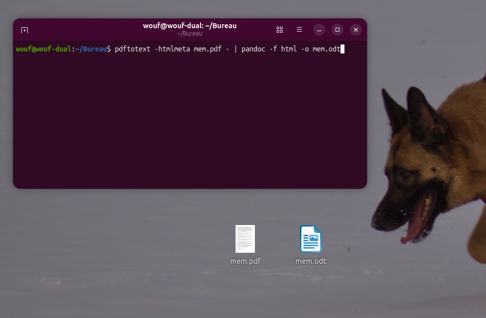 Le résultat : L’utilitaire pdftotext extrait la structure, et Pandoc la transforme instantanément en document LibreOffice (.odt) éditable. Vous récupérez vos paragraphes sans avoir à tout retaper manuellement. C’est l’avantage d’être sous Linux : il y a toujours une solution élégante !