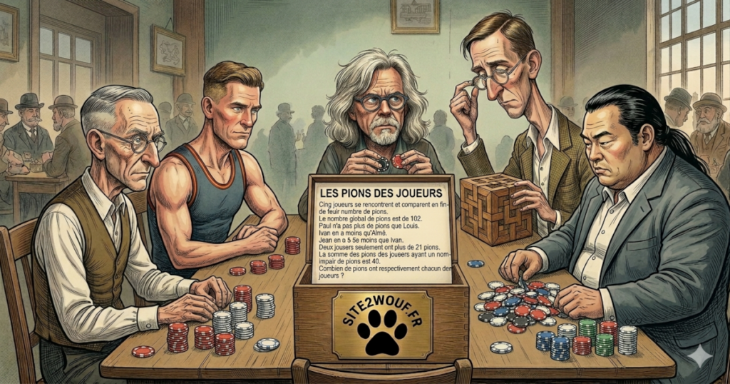Cinq amis se rencontrent et comparent en fin de partie leur nombre de pions : Wouf, Tama, Gibus, Pierre et Manu.