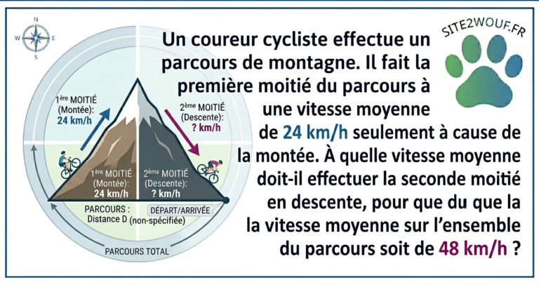 Un coureur cycliste effectue un parcours de montagne. Il fait la première moitié du parcours à une vitesse moyenne de 24 km/h seulement à cause de la montée. A quelle vitesse moyenne doit-il effectuer la seconde moitié en descente, pour…