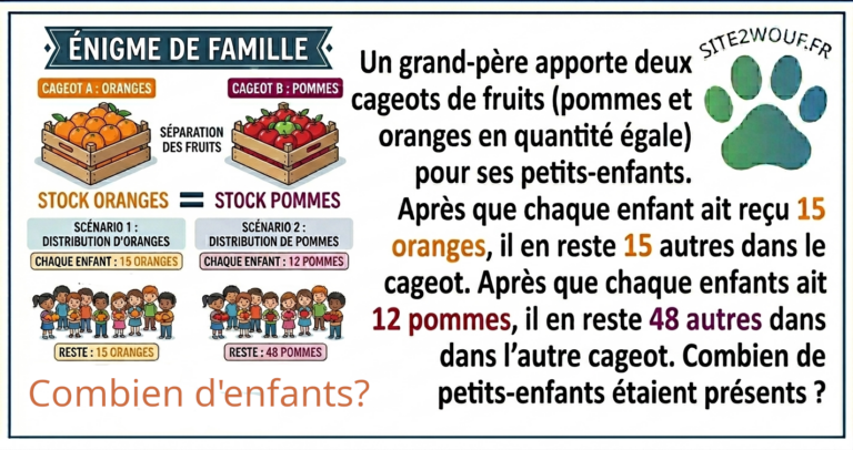 Un grand-père, au cours d’une fête de famille, apporte deux cageots de fruits pour ses petits-enfants. Il y a autant de pommes que d’oranges. Après que chaque enfant ait reçu 15 oranges, il en reste 15 autres. Après que chaque…