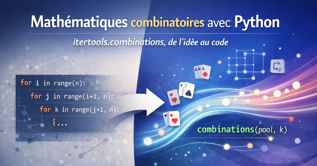 En Mathématiques, “choisir” sans tenir compte de l’ordre, c’est la combinaison. En Python, c’est exactement ce que fait itertools.combinations : il énumère toutes les sélections possibles de taille k parmi une liste, sans doublon, et sans permutation inutile. Résultat :…